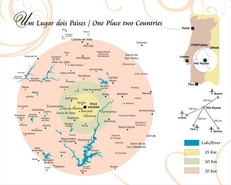 A poucos quilómetros do hotel, encontra-se Évora, Estremoz, Badajoz (Espanha), Elvas além de um sem numero de aldeias tradicionais e esplendorosas panorâmicas paisagens do campo alentejano.