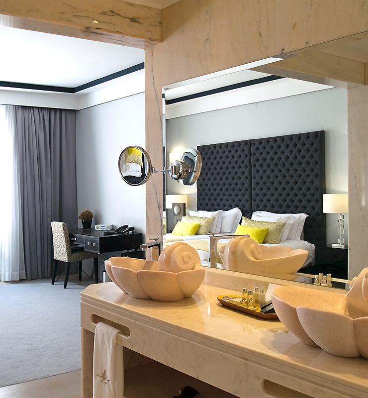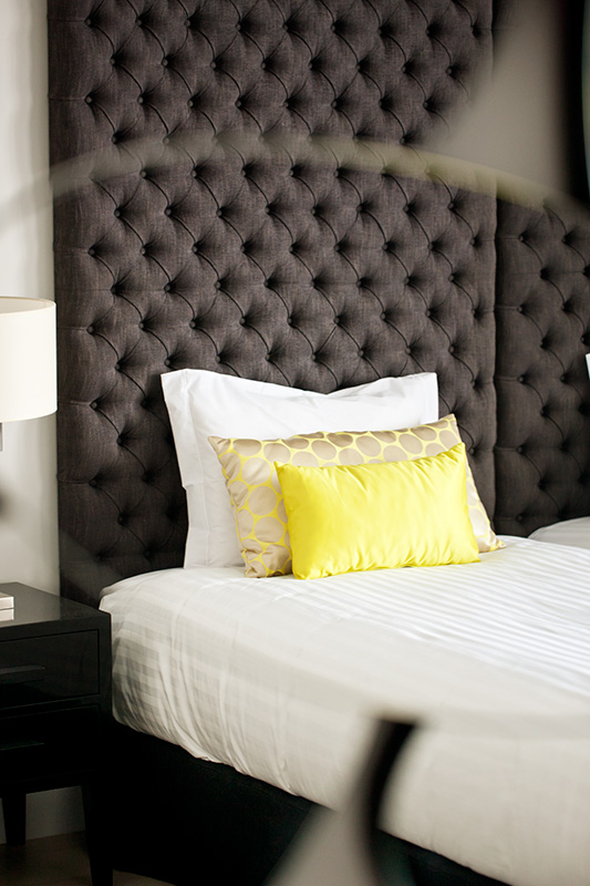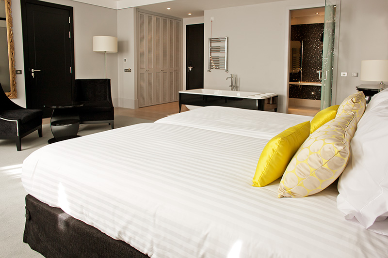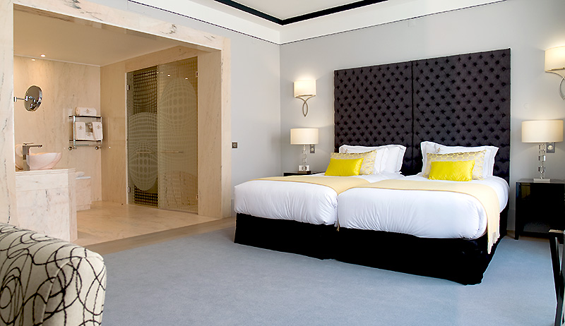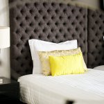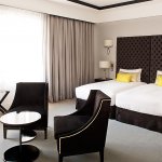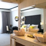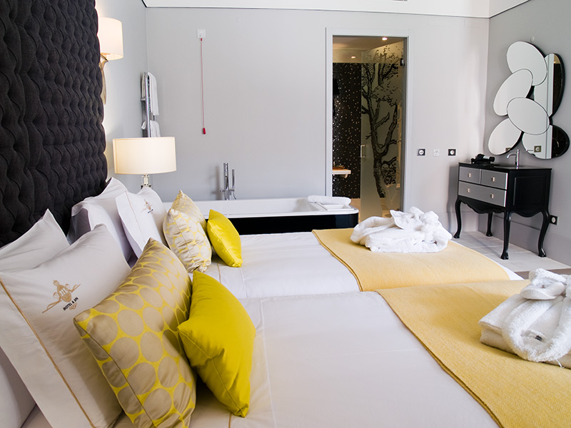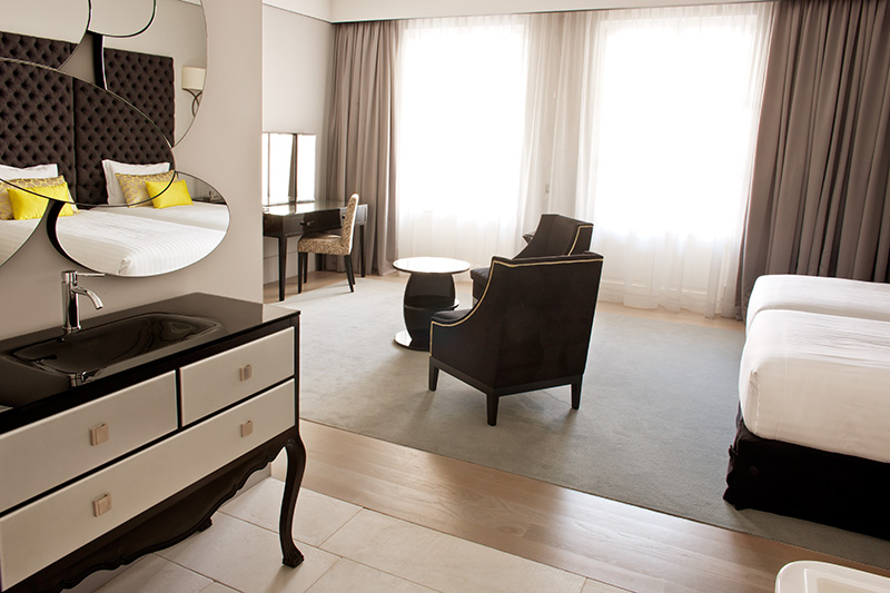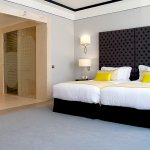Suite Júnior com cama de casal e vista para a rua. O quarto é espaçoso e confortável, com um ambiente moderno, características de design contemporâneo e oferece uma sensação de tranquilidade.